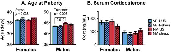 - Kaplowitz, E.T.; Savenkova, M.; Karatsoreos, I.N.; Romeo, R.D. Somatic and Neuroendocrine Changes in Response to Chronic Corticosterone Exposure During Adolescence in Male and Female Rats. J. Neuroendocrinol. 2016, 28, 12336. [Google Scholar] [CrossRef]