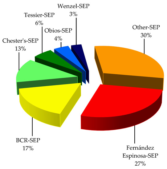 The procedures that were used less often are the BCR procedure [82,83]—17% of the papers—and Chester’s procedure [75]—used in 13% of the papers. The remaining sequential extraction procedures were employed occasionally: the Tessier SEP [84]—6%, the Obios SEP [85]—4% and the Wenzel SEP [86]—3%.