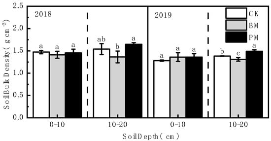 Effect of different mulch treatments (CK, no-mulch; BM, biodegradable film mulch; and PM, polyethylene film mulch) on soil bulk density. Values are means of three replicates ± standard deviation. Within each soil layer each year, the different letters above the columns indicate significant differences between treatments as tested by LSD (p < 0.05).