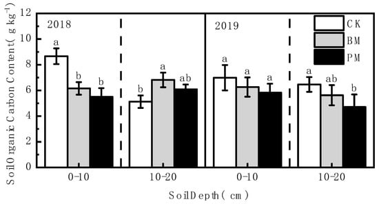Effect of different mulch treatments (CK, no-mulch; BM, biodegradable film mulch; and PM, polyethylene film mulch) on soil organic carbon content. Values are means of three replicates ± standard deviation. Within each soil layer each year, different letters above columns indicate significant differences between treatments as tested by LSD (p < 0.05).