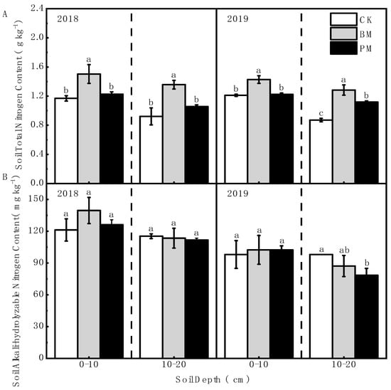 Effect of different mulch treatments (CK, no-mulch; BM, biodegradable film mulch; and PM, polyethylene film mulch) on the soil’s total nitrogen content (A) and the soil’s alkali-hydrolyzable nitrogen content (B). Within each soil layer each year, the different letters above the columns indicate significant differences between treatments as tested by LSD (p < 0.05).