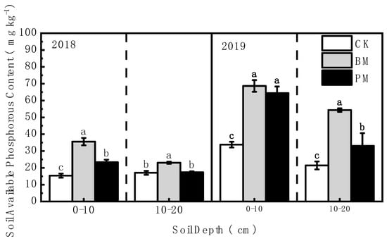 Effect of different mulch treatments (CK, no-mulch; BM, biodegradable film mulch; and PM, polyethylene film mulch) on the soil’s available phosphorous content. Values are means of three replicates ± standard deviation. Within each soil layer each year, the different letters above the columns indicate significant differences between treatments as tested by LSD (p < 0.05).