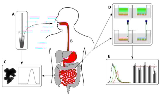 Schematic illustration of the applied experimental setup. (A) Particle dispersion preparation by ultrasonication, (B) artificial digestion using a static in vitro approach, (C) dispersion characterization by transmission electron microscopy and dynamic light scattering, (D) intestinal barrier integrity measurements of transepithelial electrical resistance and permeability of FITC-dextran, (E) analysis of cell viability and induction of apoptosis by flow cytometry. The statistical differences between the samples and the NC are marked as * p < 0.05, ** p < 0.01 and *** p < 0.001, and the statistical difference between the digested/undigested samples is marked as # p < 0.05.