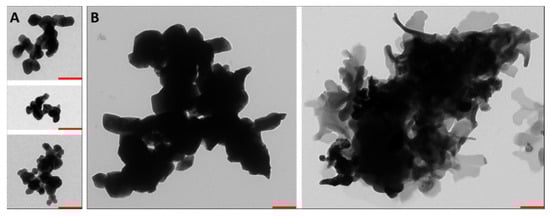 Impact of artificial digestion on the appearance of copper oxide nanoparticles (CuO-NP). Representative transmission electron microscopy images of agglomerates and/or aggregates of (A) undigested and (B) digested CuO-NP are shown. The red bars represent 250 nm.