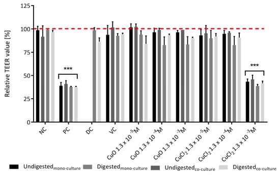 The mono- and co-cultures were exposed to 1.3 × 10−5 M, 1.3 × 10−4 M and 1.3 × 10−3 M undigested and digested CuO-NP and CuCl2, cell culture medium (negative control; NC), 10% DJ (digestion control; DC) and 10 mM EGTA with 1% Triton-X-100 as a positive control (PC) for 24 h at 37 °C, 95% humidity and 5% CO2. The TEER values were measured using a chopstick electrode and an epithelial voltammeter (EVOM2; World Precision Instruments, Sarasota, FL, USA), in accordance with Ude et al. []. The electrodes were placed in the apical and basolateral compartments of the Transwell inserts, and the electrical resistance [Ω] was measured until the value remained constant. Relative TEER values were calculated by determining the TEER values before and after incubation.