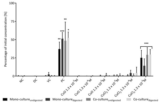 Impact of digested and undigested copper oxide nanoparticles on the barrier integrity of Caco-2 mono-cultures and Caco-2/HT29-MTX co-cultures. NC: negative control (cell culture medium); PC: positive control (10 mM EGTA and 0.1% Triton X-100); DC: digestion control (10% digestive juice in culturing medium); VC: vehicle control (0.05% BSA solution). The red line represents the initial TEER value before incubation. The statistical differences relative to the TEER values before treatment are marked as: *** p < 0.001. The error bars represent the standard deviation of three independent measurements.
