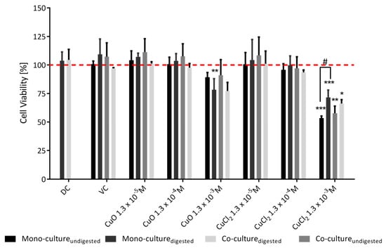 The effect of the digestion process on the cytotoxicity of copper oxide nanoparticles was determined via propidium iodide staining and flow cytometry. The cells of the Caco-2 mono-culture and the Caco-2/HT29-MTX co-culture were incubated with 10% digestive juice (DC), 0,05% BSA solution and CuO-NP/CuCl2 for 24 h. The mean vitality values were normalized to those of the negative control (NC), represented by the red line. The statistical differences between the samples and the NC are marked as * p < 0.05, ** p < 0.01 and *** p < 0.001, and the statistical difference between the digested/undigested samples is marked as # p < 0.05. The error bars represent the standard deviation of three independent measurements.
