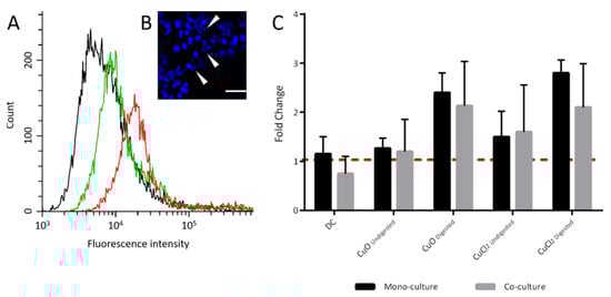 Detection of apoptosis induction by flow cytometry and fluorescence microscopy. (A) Histogram of Annexin V-FITC-stained Caco-2 mono-culture cells without (black) or with copper oxide nanoparticle (CuO-NP) treatment (green: undigested, red: digested). (B) DAPI-stained Caco-2 mono-culture cells after treatment with digested CuO-NP (white arrows indicate shrunken nuclei). (C) Fold change of apoptotic cells after treatment of Caco-2 mono- and Caco-2/HT29-MTX co-cultures with undigested and digested CuO-NP (1.3 × 10−3 M) or copper chloride (1.3 × 10−3 M). The samples were normalized to the untreated negative control (red line). All samples are means of three independent replicates and were measured in triplicate. DC: digestive control (10% digestive juice).