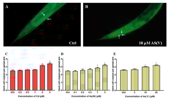 Images of AO stained apoptotic cells in the gonads (A,B) and the determination of non-toxic concentrations of (C) Cd, (D) As(III), and (E) As(V) based on germ cell apoptosis. * Means p < 0.05.