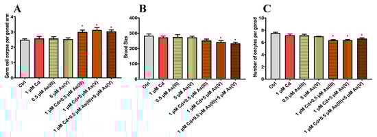 Effects of single and co-exposure to non-toxic concentrations of Cd, As(III), and As(V) on (A) germ cell apoptosis, (B) brood size, and (C) the number of oocytes. * Means p < 0.05.