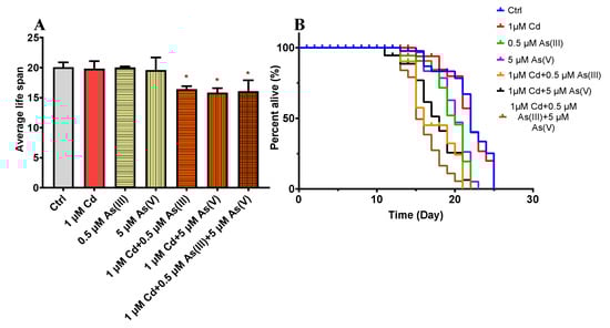 Effects of single and co-exposure to non-toxic concentrations of Cd, As(III), and As(V) on (A) average life span and (B) survival rate. * Means p < 0.05.