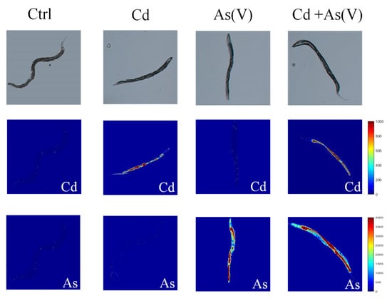 Spatial distribution of Cd and As in C. elegans exposed to Cd, As(V), and Cd-As(V).