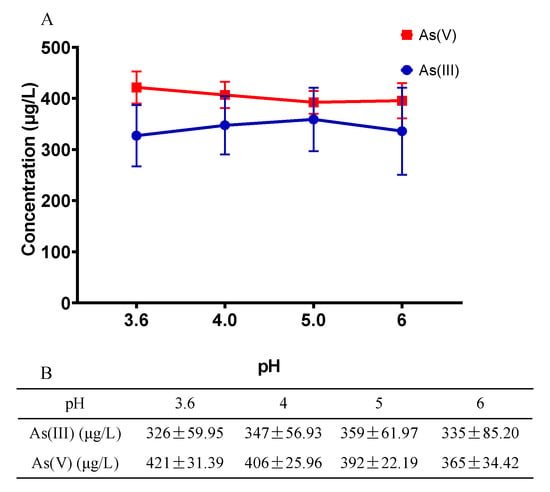 Changes of As species corresponding to different pH. (A) As(III) and As(V) trends, (B) As(III) and As(V) contents.