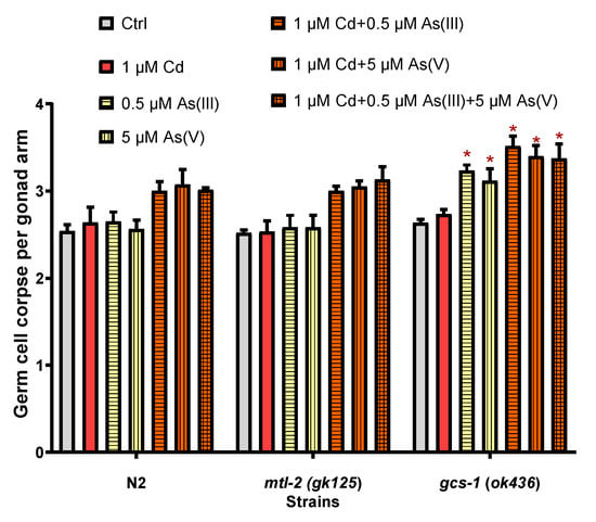 The effect of single and co-exposed Cd, As(III), and As(V) on apoptosis gonad cells of strains mtl-2 (gk125) and gcs-1 (ok436). * Means compared with the corresponding groups of N2, p < 0.05.