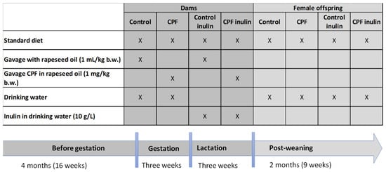 - Reygner, J.; Lichtenberger, L.; Elmhiri, G.; Dou, S.; Bahi-Jaber, N.; Rhazi, L.; Depeint, F.; Bach, V.; Khorsi-Cauet, H.; Abdennebi-Najar, L. Inulin Supplementation Lowered the Metabolic Defects of Prolonged Exposure to Chlorpyrifos from Gestation to Young Adult Stage in Offspring Rats. PLoS ONE 2016, 11, e0164614. [Google Scholar] [CrossRef]