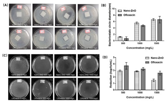 Current studies on the biology of Nano-ZnO are mainly focused on the antibacterial properties. Studies have shown that Nano-ZnO has antibacterial effects on both foodborne pathogens E. coli and Staphylococcus aureus, among which it is more sensitive to S. aureus []. Ofloxacin is a broad-spectrum antibacterial fluoroquinolone drug. It is mainly used for acute and chronic infections caused by gram-negative bacteria. It is a common clinical antibacterial drug at present. We chose to use a well-known antibiotic to make a visual comparison of the antibacterial ability of Nano-ZnO.