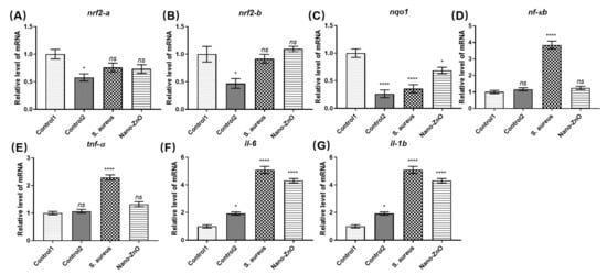 Effect of Nano-ZnO on the inflammatory response induced by S. aureus. Changes in mRNA levels of antioxidant signaling pathway (A) nrf2-a, (B) nrf2-b, (C) nqo1, and inflammatory signaling pathway (D) nf-kb, (E) tnf-a, (F) il-6, and (G) il-1b. (Control1: no treatment, Control2: wound + sterile water, S. aureus: wound + S. aureus, Nano-ZnO: wound + S. aureus + Nano-ZnO, n = 30, * p < 0.05, **** p < 0.0001).