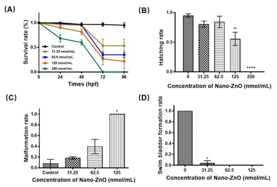 The effect of nano zinc oxide on (A) the survival rate, (B) the hatching rate, (C) the malformation rate, and (D) the swim bladder formation rate. Data are expressed as means ± SD. (n = 30, * p < 0.05, ** p < 0.01, **** p < 0.0001).