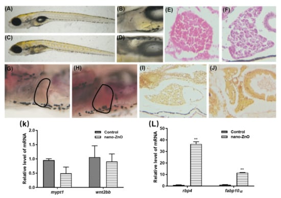 To further explore whether Nano-ZnO is toxic to liver development and to test whether the steatosis is due to underdevelopment of the liver. We examined the expression level of some liver development-related and typical liver lesion marker genes, as shown in Figure 4K,L. wnt2bb and mypt1 play important roles in the formation phase of liver progenitor cells. They are essential molecules for liver development in zebrafish []. It was found that the expression level of wnt2bb and mypt1 decreased after exposure to Nano-ZnO, but there was no significant difference. Meanwhile, there was little difference in the size and shape of the liver between the experimental and control groups and the degree of liver development was consistent. This indicated that Nano-ZnO had no effect on the development of the liver, as shown in Figure 4K. Retinol-binding protein (rbp4) is a member of the retinol-binding protein family and is mainly expressed in the liver and fat. When nonalcoholic fatty liver disease (NAFLD) occurs, the expression level of rbp4 is higher than normal []. In addition, fabp10 encodes the fatty acid binding protein (fabp), which is mainly expressed in the liver and small intestine. It has been reported that when NAFLD occurs, fabp expression is significantly higher than that in the control group []. As seen in Figure 4L, the expression of rbp4 and fabp10 genes was significantly higher in the experimental group than in the control group. This further confirmed the results of the preliminary oil red staining and H&E staining, and identified the Nano-ZnO-induced hepatotoxicity as nonalcoholic fatty liver.
