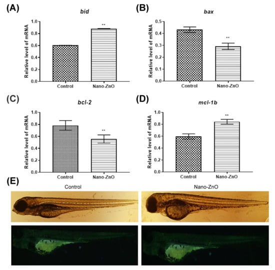 Effect of 125 nmol/mL Nano-ZnO on apoptosis in zebrafish. Changes in mRNA level of pro-apoptosis genes (A) bid and (B) bax, and anti-apoptosis genes (C) bcl-2 and (D) mcl-1b. (E) Acridine orange apoptosis staining. (n = 30, ** p < 0.01).