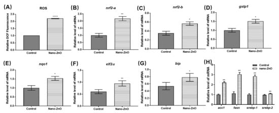 Mechanism of liver injury caused by 125 nmol/mL Nano-ZnO. (A) Relative levels of ROS; changes in mRNA levels of antioxidant signaling pathways (B) nrf2-a, (C) nrf2-b, (D) gstp1, and (E) nqo1; changes in mRNA levels of ER stress-related genes (F) elf2a and (G) bip. (H) Changes in mRNA levels of the lipid metabolism-related genes acc1, fasn, strebp-1 and strebp-2. (n = 30, * p < 0.05, ** p < 0.01, **** p < 0.0001).