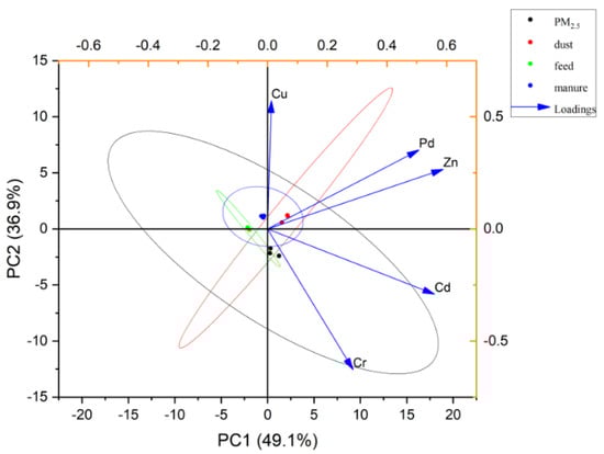 3.6.2. The Correlations between PM2.5 and Environmental Samples (Feed, Manure, and Dust)