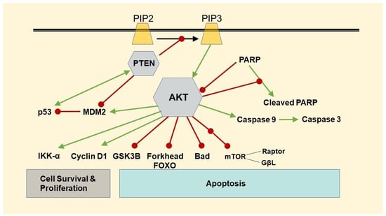 Schematic representing the relationship between proteins associated with apoptosis. Abbreviations: PIP2—phosphatidylinositol 4,5-bisphosphate; PIP3—phosphatidylinositol 3,4,5-trisphosphate; PTEN—phosphatase and tensin homolog; AKT—Ak strain transforming; GSK3β—glycogen synthase kinase 3 beta; IKK-ɑ—IkappaB kinase; MDM2—mouse double minute 2 homolog or E3 ubiquitin-protein ligase; PARP—poly (ADP-ribose) polymerase; mTOR—mechanistic target of rapamycin; Bad—Bcl-2-associated death promoter. Green arrows represent stimulation and red arrows represent inhibition.