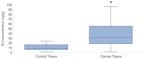 Levels of Ni in human pancreatic tissue in the investigated population. Boxes represent interquartile intervals (25–75%), while lines inside boxes represent medians. The box represents the interquartile range (25–75th percentile), the line within the box represents median value and ends of the whiskers represent the minimum and maximum values within the group. The asterisk indicates a statistically significant difference from the control levels (Mann–Whitney U test, p < 0.001).