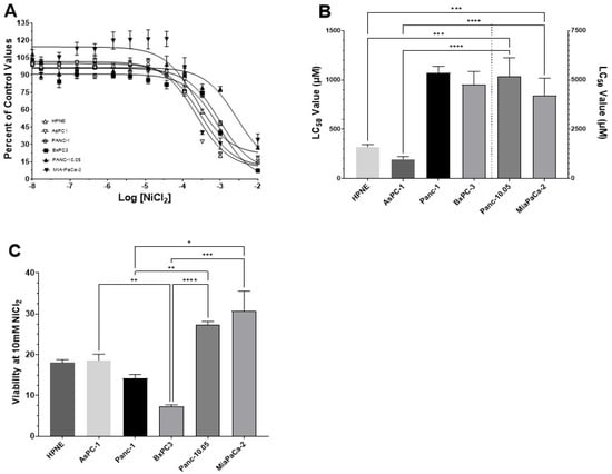 LC50 curves for NiCl2 in PDAC cell lines. Cells were exposed to increasing concentrations of NiCl2 (0–10 mM) for 48 h and cell viability was measured using the MTT assay. Curve shapes best fitted a single site model (three-parameter) (A). The rank order for NiCl2 LC50 values was AsPC-1 < HPNE < BxPC-3 = Panc-1 << Panc-10.05 = MiaPaCa-2 (B). Comparing lethality at 10 mM (C), with viability expressed as percent of control values, the BxPC-3 was the most sensitive cell line, whereas the Panc-10.05 and MiaPaCa-2 cells were the least sensitive. Data are expressed as the mean ±SD of eight assays performed in duplicate (* p < 0.05; ** p < 0.01; *** p < 0.001; **** p < 0.0001).