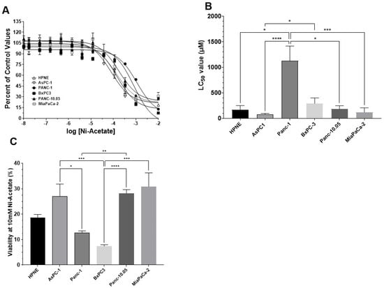 LC50 curves for Ni-acetate in PDAC cell lines. Cells were exposed to increasing concentrations of NiCl2 (0–10 mM) for 48 h and cell viability was measured using the MTT assay. Curve shapes were best fitted to a single site model (three-parameter) (A). The rank order for Ni-acetate LC50 values was AsPC-1 < MiaPaCa-2 ≤ HPNE ≤ Panc-10.05 < BxPC-3 << Panc-1. (B). Except for the Panc-1 cells, all the PDAC cell lines exhibited lower LC50 values after exposure to Ni-acetate compared to NiCl2. Comparing lethality at 10 mM (C), the BxPC-3 was the most sensitive of the cell lines whereas AsPC-1 and Panc-10.05 cells were least sensitive. Data are expressed as the mean ± SD of eight assays performed in duplicate (* p < 0.05; ** p < 0.01; *** p < 0.001; **** p < 0.0001).