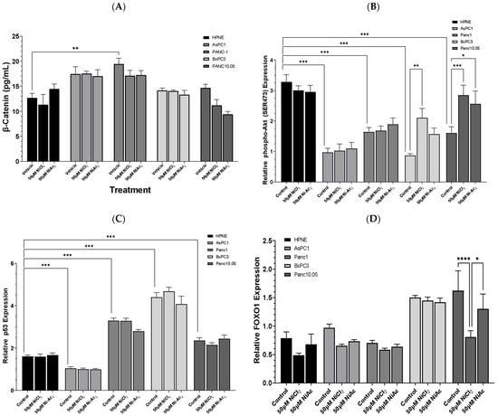 Quantification and expression of key cell function proteins after 48 h exposure to 50 μM NiCl2 or Ni-acetate in PDAC cell lines. These assays quantified the amount of β-catenin (A), phospho-AKT (B), p53 (C), and FOXO-1 (D). The predominant difference was in the basal levels of each protein and the differences between the cell lines. The expressions of phospho-AKT (B) and p53 (C) typify this response. Treatment with either NiCl2 or Ni-acetate had little effect after 48 h, except for phospho-AKT (B) and FOXO-1 (D), in which NiCl2 and Ni-acetate increased phospho-AKT expression and decreased FOXO-1 expression in Panc-10.05 cells. In BxPC-3 cells, exposure to NiCl2 increased phospho-AKT expression 146% compared to vehicle control. Data are expressed as the mean ± SD of 4 assays performed in duplicate (* p < 0.05; ** p < 0.01; *** p < 0.001; **** p < 0.0001).