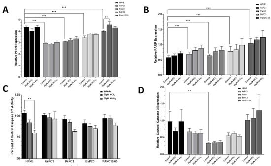 The cells were incubated with 50 μM NiCl2 or Ni-acetate for 48 h, and the expression of PTEN (Figure 6A), PARP (Figure 6B) was quantified. The PTEN expression was dependent on the cell line (F4,45 = 65.3; p < 0.0001), with higher levels of basal expression in the HPNE control group compared to each of the PDAC cell-line controls (p < 0.001). Exposure to 50 μM NiCl2 significantly increased the PTEN expression in the Panc10.05 cells compared to their vehicle control (p < 0.01). The expression of PARP exhibited an inverse profile compared to what was observed with the PTEN expression (F4,45 = 5.33; p = 0.004). The HPNE control cells had significantly lower PARP expression than each PDAC cell-line control group (p < 0.001). The treatment significantly impacted the activity of caspase (Figure 6C), as did the cell line (F4,105 = 2.79; p = 0.0299) with a trend towards reductions in caspase activity (F2,105 = 9.65; p = 0.0001). Exposure to NiCl2 resulted in small, non-significant, reductions in caspase 3/7 activity. Exposure to Ni-acetate resulted in larger reductions in caspase 3/7 activity, with a significant (p < 0.01) 20.6% reduction in the HPNE group. The expression of cleaved (active) caspase 3 (Figure 6D) was significantly (F4,45 = 27.79; p < 0.0001) dependent on the cell line, with a minimal effect of treatment. Only the Panc-1 control group exhibited significantly (p < 0.01) lower expression than the HPNE control group.