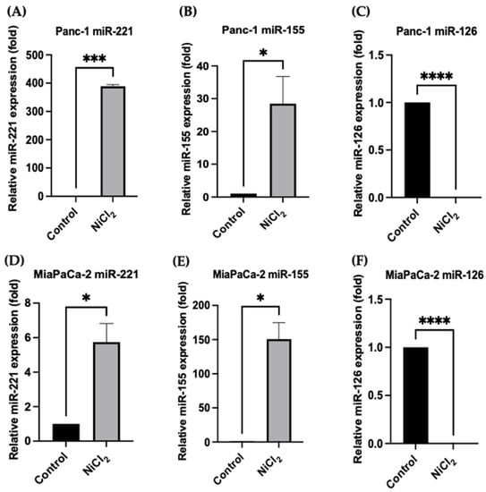 NiCl2 treatment-mediated effects on miR expression levels in PDAC cells. (A–C): Effects of NiCl2 in the Panc-1 cell line: miR-221 relative expression levels (A); miR-155 relative expression levels (B); miR-126 relative expression levels (C). (D–F): Effects of NiCl2 in the MiaPaCa-2 cell line: miR-221 relative expression levels (D); miR-155 relative expression levels (E); miR-126 relative expression levels (F). NiCl2 treatment effects were evident in the expression levels of miR-221 (p < 0.001; Panc-1, p < 0.05; MiaPaCa-2), and miR-155 (p < 0.05 for all) compared to the control cells, while the expression levels of miR-126 were significantly downregulated (p < 0.0001 for all). The column graphic represents the average of three replicates of RNA isolated from the Panc-1 and MiaPaCa-2 cell lines. Data normalized according to RNU6 expression by fold analysis (n = 3, p < 0.05); exact p-values are indicated (* p ≤ 0.05; *** p ≤ 0.001; **** p ≤ 0.0001); error bars indicate SD.
