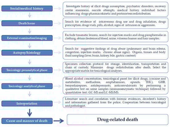 Nowadays, deaths from overdose prevalence continue to increase also due to the diffusion of novel illicit drugs [1]. Moreover, a higher risk of overdose is associated with younger age, polydrug use, and heroin abuse [2,3]. Postmortem toxicology has a crucial role in determining the cause and manner of death when illicit drugs assumption or poisoning is suspected. Therefore, it has relevant public health and social function [4]. History and death scene investigation alone is not sufficient to predict a drug intoxication. The toxicology laboratory can identify and measure drugs in biological samples assisting the forensic pathologist and the medical examiner in their work [5,6]. The recommendations regarding the investigation, evaluation, and certification of deaths related to drugs misuse were recently updated by the National Association of Medical Examiners and an expert panel of medical toxicologists [1,7]. The best evidence provided in the literature worldwide suggests the importance of harmonizing the investigation in drug-related fatalities. The quality of forensic diagnosis is affected by the quality of toxicological analyses, technical equipment, personnel competence, financial resources. Moreover, there are extreme regional and national differences in post-mortem diagnosis of drug-related deaths. Such scenarios influence investigation results, leading to a lower quality contributing to epidemiological reports and public health and law enforcement measures [8,9,10,11]. In this regard, high-quality and standardized methodologies are required in forensic diagnosis in case of recognition of drug-related deaths When a drug intoxication is suspected, a multidisciplinary approach is mandatory to establish the cause and manner of death. This article reports eight cases of death related to drug misuse or abuse of substances in which a complete diagnostic algorithm based on the best evidence provided in the literature was essential to answering forensic questions.