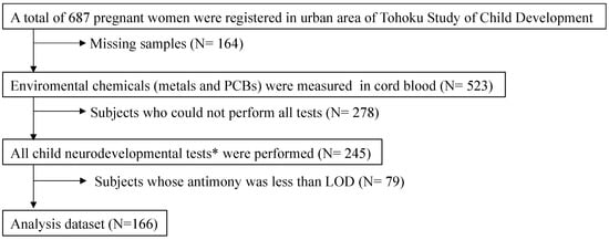 - Nakai, K.; Suzuki, K.; Oka, T.; Murata, K.; Sakamoto, M.; Okamura, K.; Hosokawa, T.; Sakai, T.; Nakamura, T.; Saito, Y.; et al. The Tohoku Study of Child Development: A cohort study of effects of perinatal exposures to methylmercury and environmentally persistent organic pollutants on neurobehavioral development in Japanese children. Tohoku J. Exp. Med. 2004, 202, 227–237. [Google Scholar] [CrossRef] [Green Version]
