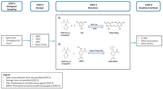 - Chen, J.-L.; Huang, Y.-J.; Pan, C.-H.; Hu, C.-W.; Chao, M.-R. Determination of urinary malondialdehyde by isotope dilution LC-MS/MS with automated solid-phase extraction: A cautionary note on derivatization optimization. Free Radic. Biol. Med. 2011, 51, 1823–1829. [Google Scholar] [CrossRef]