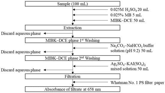 A sample of 100 mL was put into separatory funnel, followed by adding, in series, 20 mL pre-treatment reagent (pH 3), 5 mL 0.025% MB, and 50 mL MIBK-DCE (3:1) solvent. The mixture was shaken for 1 min and allowed to settle for a few minutes until the aqueous and solvent layers were clearly separated. After discarding the aqueous phase layer, 50 mL of the first washing reagent (Na2CO3–NaHCO3 buffer solution at pH 9.2) was added to the MIBK-DCE layer, followed by shaking for 1 min and phase separation. After discarding the aqueous phase, the second washing process using 50 mL of the Ag2SO4 and AlK(SO4)2 mixture was repeated as the first washing process. The aqueous layer was then discarded. The extracted MIBK-DCE layer was filtered through a water-repellent, phase-separating paper (Whatman® 1PS, Sigma-Aldrich, St. Louis, MO, USA). Absorbances of the filtrate were measured at 658 nm using a spectrophotometer (DU800, Beckman Coulter, Indianapolis, IN, USA). Results from the MIBK-DCE method were compared with those from the chloroform method [,,].
