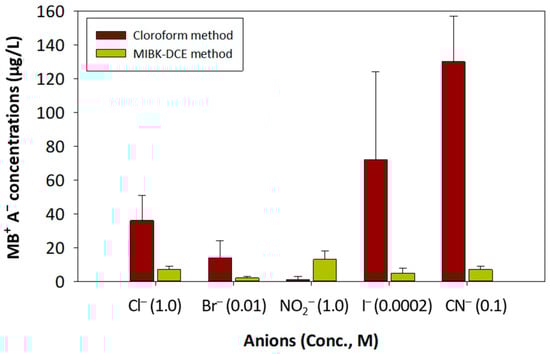 Various inorganic and organic anions (A−) that co-exist in aqueous samples form MB+A− complexes. If these complexes are present in the MIBK-DCE solvent phase, they interfere in the analytical results and result in a higher AS analysis than expected [,,,]. Cations in water (C+(aq)) form C+AS− ion pairs with anionic surfactants (AS−(aq)), but their interfering effect on AS extraction by MIBK-DCE was negligible as compared to that by anions []. Any analytical method should remove MB+A− ion pairs to reduce error [,,]. The reference chloroform method requires several back-washing processes with deionized water to remove such interferences, but the washing efficiency was, in many cases, unsatisfactory [,,,,]. This might be related to the insufficient partitioning capacity of water among A−, MB+A−, and MB+AS−.