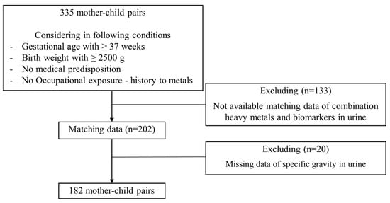 In the stage of sampling, a total of 335 mother–child pairs in the CHECK cohort were recruited using the following inclusion criteria: gestational age ≥ 37 weeks, birth weight ≥ 2500 g, no medical predisposition, and no occupational exposure history to metals. Among a total of 335 mother-child pairs in the CHECK, 182 pairs were included in the present study after excluding pairs with no matching data for a combination of heavy metals and biomarkers in urine (n = 133) or missing data of specific gravity of urine (n = 20) (Figure 1). This study was conducted after explaining the purpose and methods of this study to participants. It was approved by the IRB (Institutional Review Board) at the School of Public Health, Seoul National University, Korea (IRB no. 8-2012-04-20).