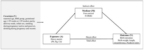In order to investigate mediation effects of biomarkers (free-cortisol or 8-OHdG) on the association between heavy metals and birth outcomes, we conducted causal mediation analyses. Unstandardized indirect effects were computed for each of 1000 bootstrapped samples, and 95% confidence intervals were computed by determining indirect effects at the 2.5th and 97.5th percentiles. The total effect was the effect of maternal heavy metal exposure on the outcome. The indirect effect was the effect of heavy metal exposure on birth outcomes mediated through maternal biomarkers. The direct effect was the effect of maternal heavy metal exposure on the birth outcome without maternal biomarkers. The percent mediated was calculated as the value of the indirect effect divided by the sum of the indirect effect and direct effect (total effect). The conceptual model for mediation analysis in this study is illustrated in Figure 2.