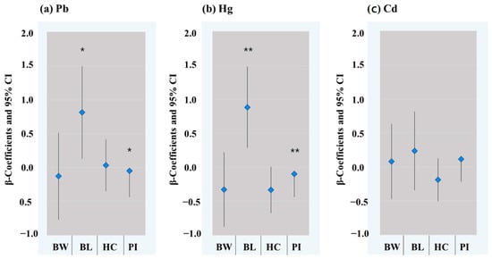 Figure 3. β-coefficients and 95% CIs for correlations of maternal urinary (a) Pb, (b) Hg, and (c) Cd levels with birth weight, birth length, head circumference, and Ponderal index after adjusting for maternal age, pre-pregnancy BMI group, gestational age (<39 weeks or ≥39 weeks), parity, delivery mode, infant sex, smoking during pregnancy (active and passive), drinking during pregnancy, and income. Pb, Cd, and Hg levels in maternal urine samples were adjusted using urine specific gravity. Birth weight was divided by 100 to fit the scale of the figure. * p < 0.05, ** p < 0.01. BW: birth weight; BL: birth length; HC: head circumference; PI: Ponderal index.