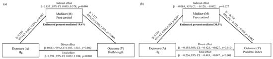 Figure 4. Mediation effect of free cortisol on associations of maternal urinary Hg with (a) birth length and (b) the Ponderal index. Percent mediated was derived from the indirect effect (β)/(direct effect (β) + indirect effect (β)) × 100.
