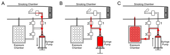 Schematic process of the dilution. (A) Open smoke valve (1) to generate puff. (B) Open air valve (2) to draw in air to dilute the smoke. For higher dilutions, part of the smoke—air mixture was pushed out of the air valve (2) and additional air was drawn in via the air valve (2). (C) Open exposure valve (3) to direct the smoke–air mixture into the exposure chamber and onto the cells. At the end of the cycle, an additional push with fresh air was used to remove the smoke out into the smoking chamber.