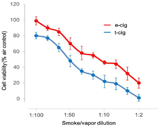 The present and other studies have—as always—limitations. To begin with, in vitro investigations only provide data on short-term results and do not enable for in vivo long-term effects of e-cigarette usage to be predicted. As a result, no conclusions can be drawn about the long-term safety of e-cigs or the potential for harm reduction. In addition, this study only focused on a specific cell line, i.e., oral gingival keratinocytes, while other studies focused on other specific cellular systems. Notably, our group put the main focus on an oral surrogate cell model. The availability of flavors as additives for e-cig vapor and various forms of vaporizing devices is rising and it is unregulated; flavors were not addressed in the current study. Flavors, particularly cinnamon-containing beverages, have been proven to cause toxicity in vitro and in animals [12]. Comparing two physically dissimilar agents as e-cig aerosol and t-cig smoke and attempting to normalize is, however, a difficult task. Nicotine is one of the few chemicals in both traditional and electronic cigarettes that is associated to toxicity or addiction. Additionally, standardizing on nicotine consumption seems sensible because the user will require specific amounts of nicotine, making the total uptake of t-cigs and e-cigs comparable [47].