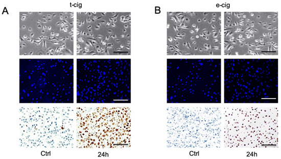 Apoptotic cells and their morphology measured by TUNEL assay and DAPI staining. (A) t-cig smoke and (B) aerosol e-cig. Phase-contrast microscopy (upper), DAPI staining nuclei (middle), and TUNEL-positive cells stained as dark brown (lower). Scale bar = 100 μm.