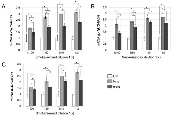 Inflammatory cytokine gene expression by HEGK exposed to the negative control and four increased dilutions of aerosol/smoke from the e-cig and t-cig (1:2, 1:10, 1:50, 1:100). (A) IL-1α, (B) IL-1β, (C) IL-6. Means ± SD, * p < 0.05.