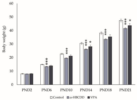 3.2. Effects of α-HBCDD and VPA Exposure on Male Offspring Weight