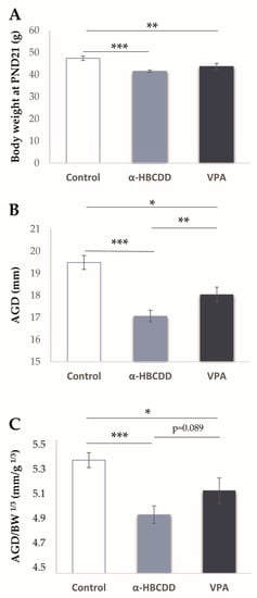 3.3. Effects of α-HBCDD and VPA Exposure on Anogenital Distance (AGD)