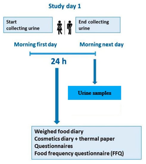 A detailed description of the EuroMix study, including the study’s inclusion/exclusion criteria, can be found in Husøy et al. []. In short, a total of 144 participants (44 men and 100 women) were recruited amongst employees of governmental institutes and authorities and universities in the counties of Oslo and Akershus in Norway between September 2016 and November 2017. The recruited participants might not be a representative sample of the overall Norwegian population, but this was not the aim of the biomonitoring study. A sample size of approximately 150 was considered sufficient as previous studies conducted by our team using comparable sample collection and study design had similar sample sizes [,,]. Participants collected every urination during a 24-h period in separate containers and marked them with the time and date. The day after collection, the samples were measured and stored as pools of urine combining all the voids into three time periods/pools (morning time group 1 = 06:00–12:00, mid-day time group 2 = 12:00–18:00, evening time group 3 = 18:00–06:00 the next day) (Figure 1). Of the 144 participants, six did not submit urine for one of the time periods; these were excluded from the analyses.