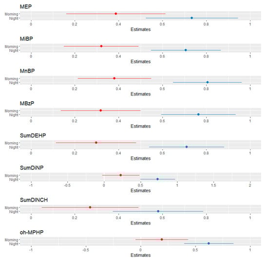 The LME models for most phthalates/DINCH metabolites showed significant associations between urinary EDC concentrations and the time of the day (Figure 2, Table S4i–xiii). All models were adjusted for age, sex, BMI, dietary habits, and PCP use. Statistically significant positive associations were found between time (morning) and MiBP (β = 0.32, 95% CI: 0.15, 0.49, q < 0.001), MnBP (β = 0.38, 95% CI: 0.21, 0.55, q < 0.001), MBzP (β = 0.32, 95% CI: 0.14, 0.50, q = 0.006), MEP (β = 0.39, 95% CI: 0.16, 0.61, q = 0.006), and SumDEHP (β = 0.30, 95% CI: 0.11, 0.48, q = 0.011), but not with SumDiNP, SumDINCH, and oh-MPHP. Statistically significant associations (q < 0.001) were also found between time (night) and all phthalate metabolites (Table S4). There were statistically significant differences in the concentration of some phthalates (MiBP, MnBP, MBzP, SumDEHP, SumDiNP, and SumDINCH) by sex (Table S4). However, only MiBP, MnBP, SumDEHP, and SumDINCH remained significantly different (q < 0.05) after applying the Benjamini–Hochberg correction. The effect of time on the concentration of phthalates was unaffected by BMI (Table S4).